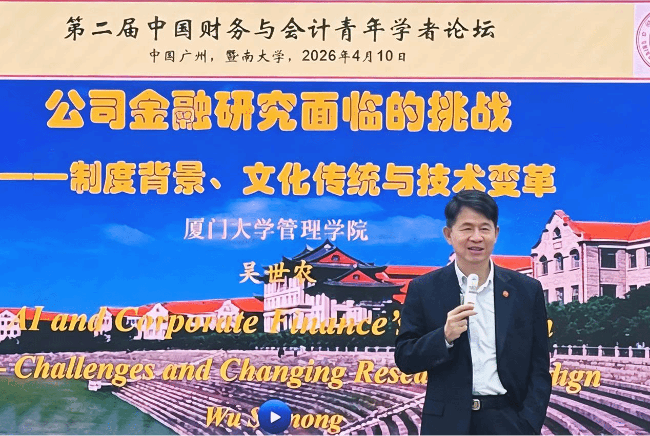 首先,中国财务与会计学术年会理事会主席、厦门大学原副校长吴世农教授应邀为本次论坛做主题报告,汇报主题为《公司金融研究面临的挑战——制度背景、文化传统与技术变革》。系统梳理了公司金融学科百年演进脉络,深入探讨中国独特的制度环境与文化传统对公司财务研究的深层影响,并就人工智能技术如何重塑学科研究范式与人才培养模式提出前瞻性思考。演讲内容兼具历史纵深与现实关怀,为与会青年学者带来深刻启发。