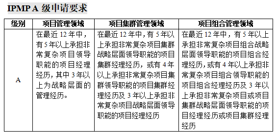 1、IPMP A级(Level A)证书分为三个领域,分别为认证的国际特级项目经理(Certified Project Director)、认证的国际特级项目集群经理(Certified Programme Director)和认证的国际特级项目组合经理(Certified Portfolio Director),获得这一级认证的项目管理人员具有领导一个大型组织的所有项目的项目管理能力,或者具有负责大型项目包含的所有项目的能力与资质。符合下列条件可以申请IPMPA级: