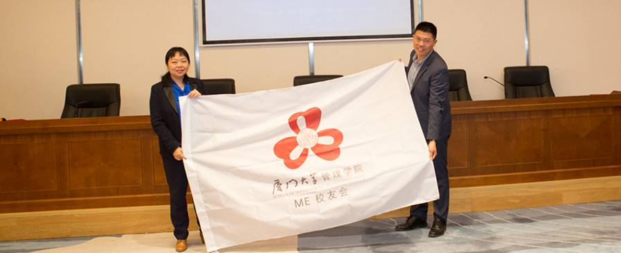 完成聘书颁发后,会议现场新任会长蒋英与上届会长陈辉煌交接ME校友会会旗,并进行了户外健身俱乐部、创业俱乐部的交接和八雅文化俱乐部成立仪式。