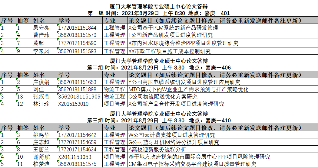 三、拟于2021年9月授学位的同学,将以下材料在各项材料标注的截止时间前交至院专业硕士办公室ME(嘉庚一407)(含以前答辩本次申请学位者)(以上1-5项材料截止时间为2021年9月10日11点,如有变动以答辩群里通知的为准):