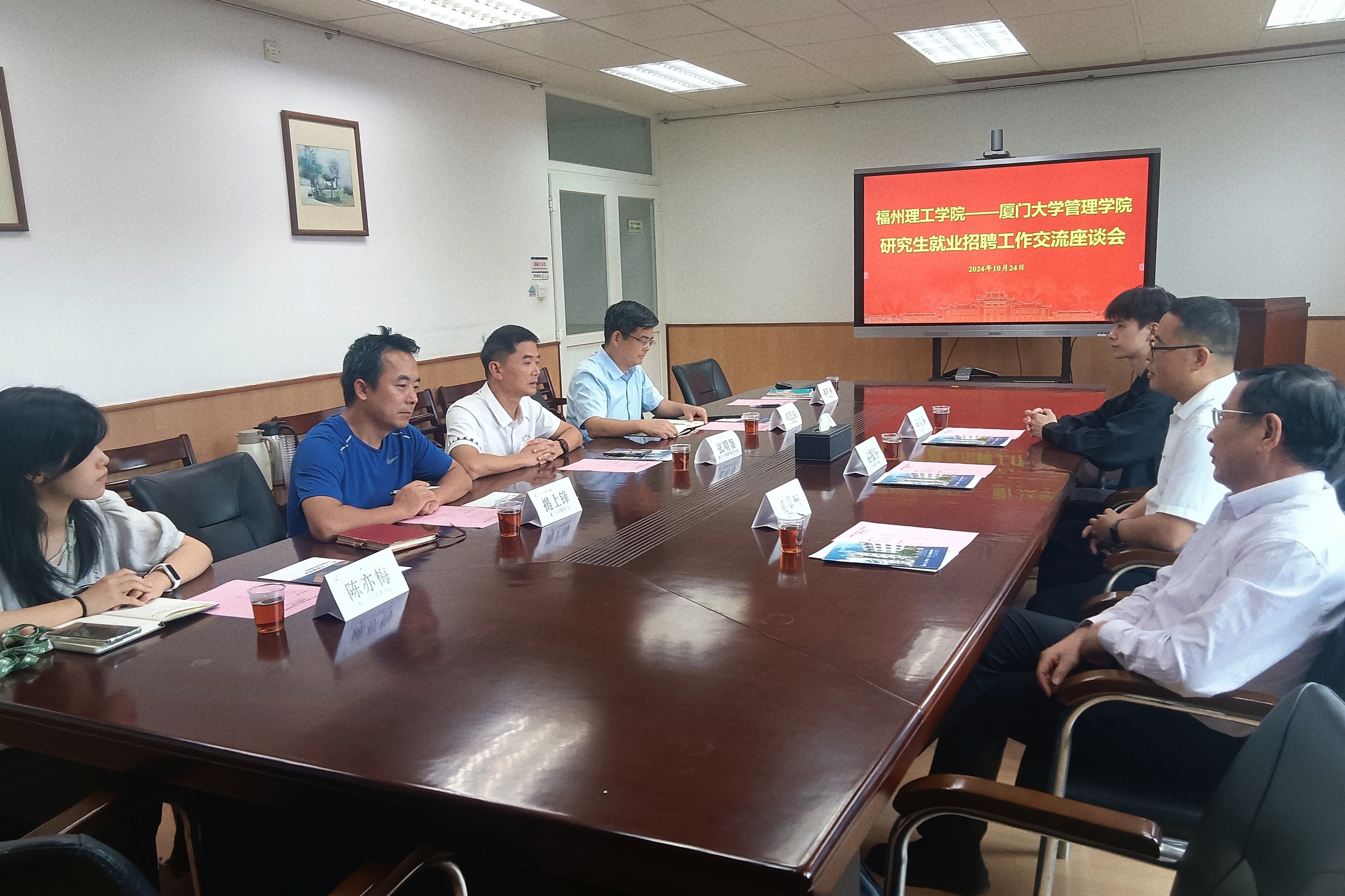 2024年10月24日,福州理工学院副校长谷振宇、经济管理学院院长黄章树、教学秘书陈宝满来我院访问并开展座谈交流。厦门大学管理学院党委书记张明智、党委副书记周民钦、团委副书记揭上锋、辅导员陈亦梅,以及职业发展秘书潘彩燕出席座谈会。