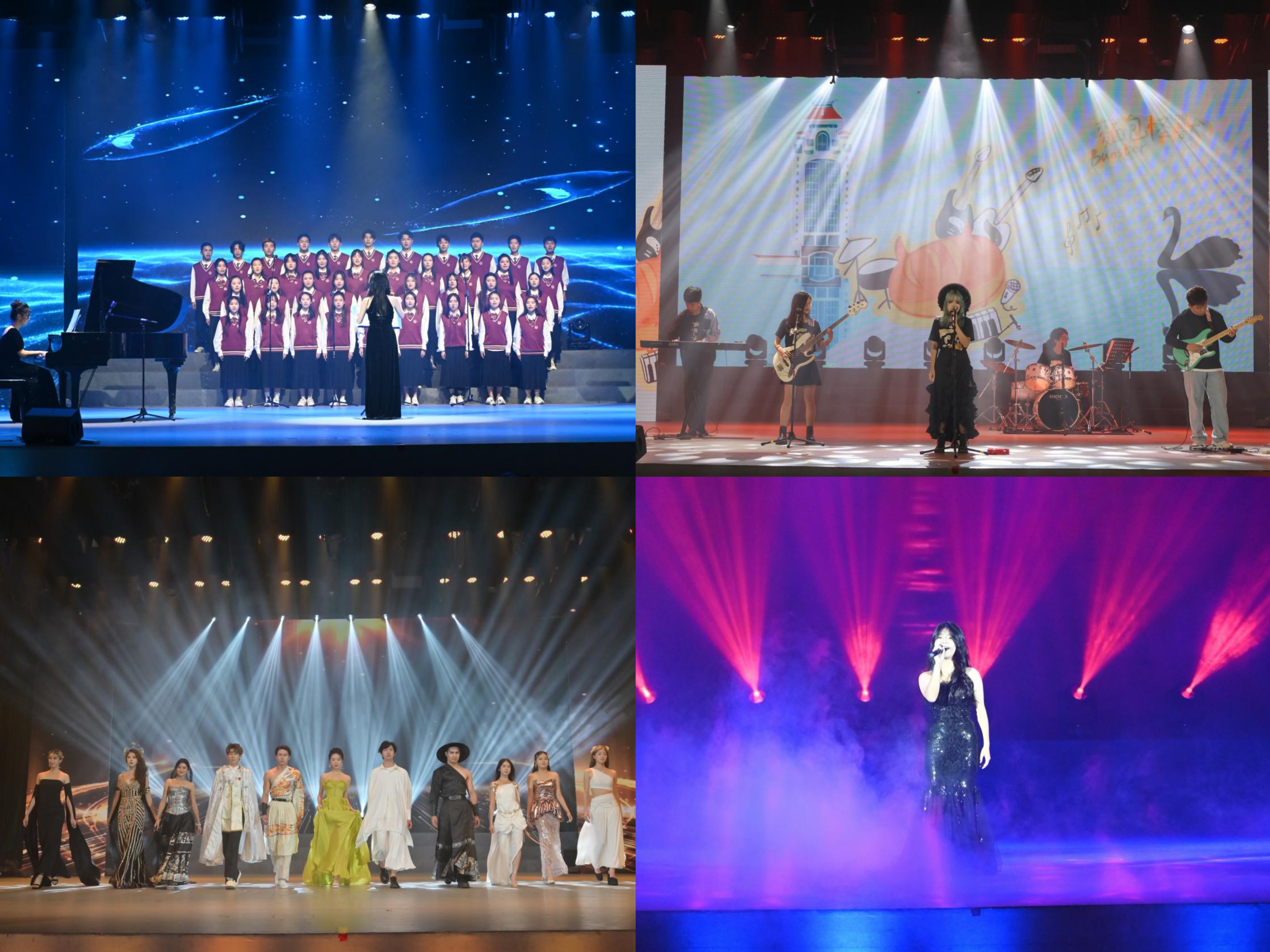伴随着面包怪兽乐队的登台,晚会进入终章,三首经典歌曲串烧引起同学们一阵阵欢呼。光影交错,模特队带来的走秀《神霄绛阙》,展现了文化的交融与时尚的魅力,赢得了同学们的惊叹。而舞蹈《whiplash》以强烈的舞台感染力,将晚会再次推向高潮。晚会接近尾声,陈敏叡个人独唱《同花顺》,精湛的演唱技巧令人叹服。这个美好的夜晚由空灵美丽的合唱《大鱼》结尾,仿佛让人身处“满船清梦压星河”的夜色中。晚会的终章也标志着迎新晚会落下帷幕,但厦园逐梦之旅才刚刚开始。愿凤凰花的火红与热情,伴随每一位新生在厦园的每一天,勇敢地追逐梦想,坚定地走向未来。