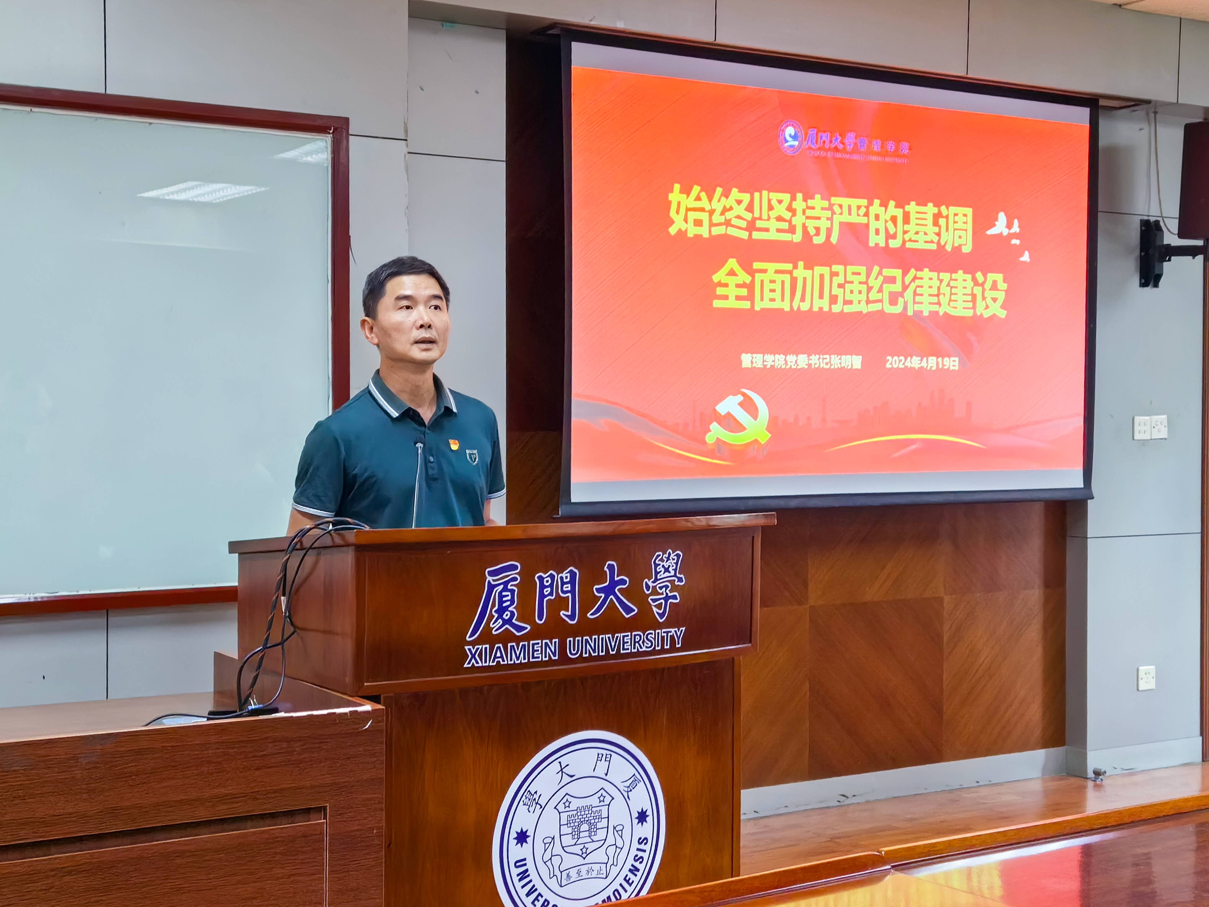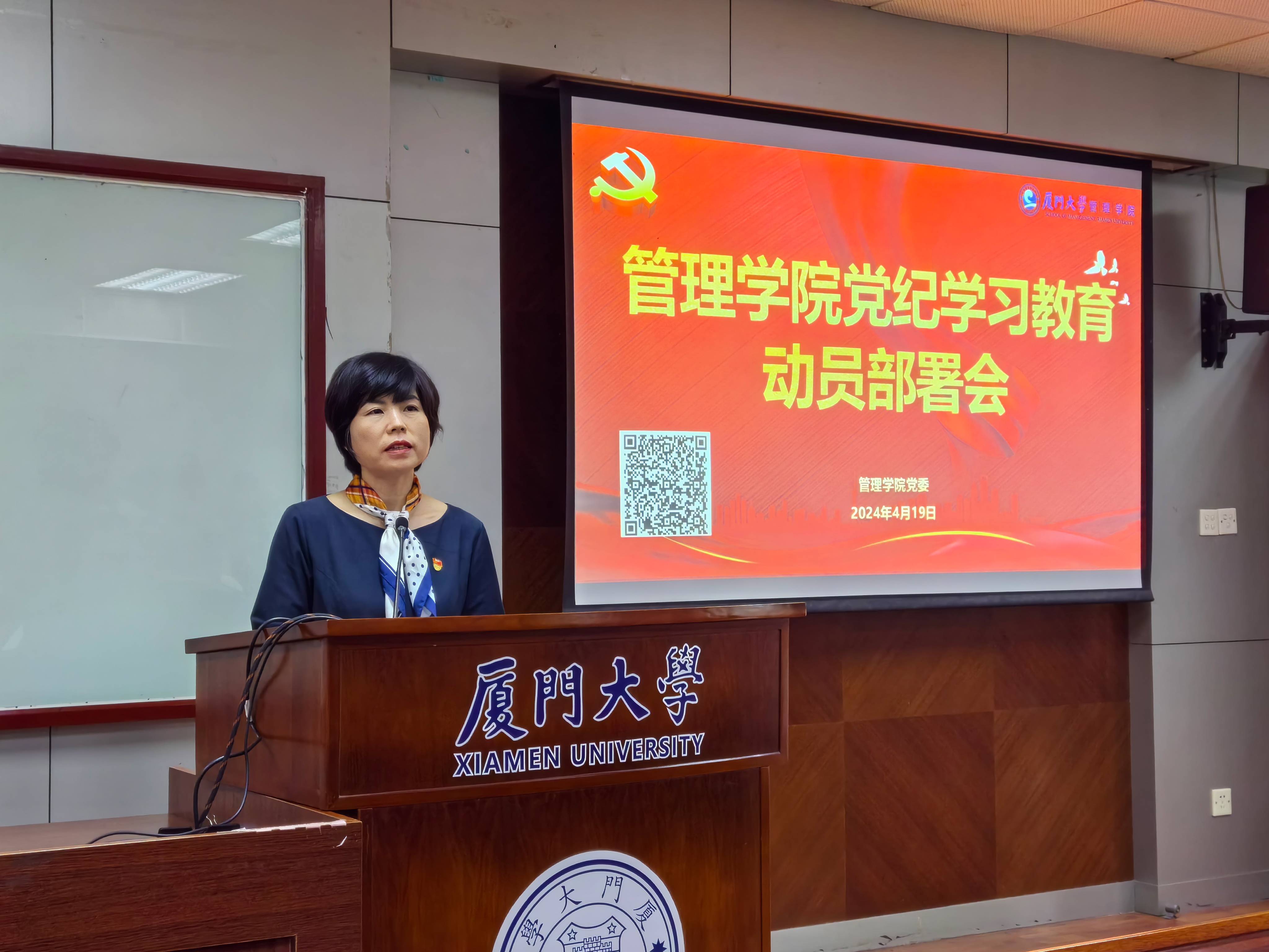 4月19日,管理学院在嘉庚二201和嘉庚一301先后召开学生党员和教师党员党纪学习教育动员部署会,传达学习习近平总书记关于党纪学习教育的重要讲话和重要指示精神,贯彻落实学校党纪学习教育动员会议精神,并就开展学院党纪学习教育工作作动员部署。学院党委书记张明智、教师党支部书记及全体学生党支部支委参加会议,会议由党委副书记、纪委书记郑碧娇主持。